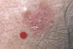 SCC generally appears as a crusted or scaly growth of the skin that is often red and inflamed. SCC can appear as a growing tumor, a nonhealing growth, or a thick crust. SCC is more common on sun-exposed areas, such as the face, neck, arms, legs, bald scalp, tops of the hands, and ears. However, SCC can appear anywhere on the body, even on the lips, inside the mouth, and on the genitalia. SCC is often tender or painful to the touch and can appear and grow quickly in 2 to 3 months [Figure 1].