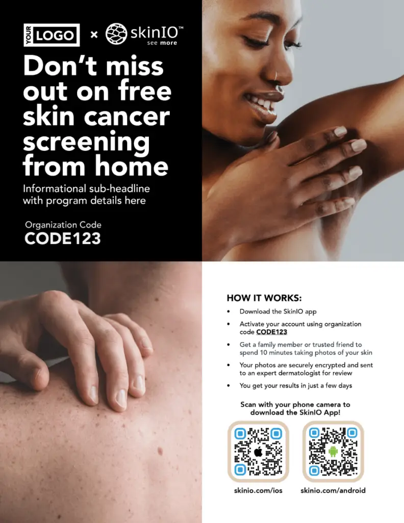 1 in 5 of us will develop skin cancer by age 70. Unlike other cancers, skin cancer is entirely and easily curable if it’s caught early. And it hides in plain sight. But if you’re not looking for it, you could miss it. With SkinIO, your employees can screen their skin with the only technology built to see skin like a dermatologist. All they need is 10 minutes and a smartphone.